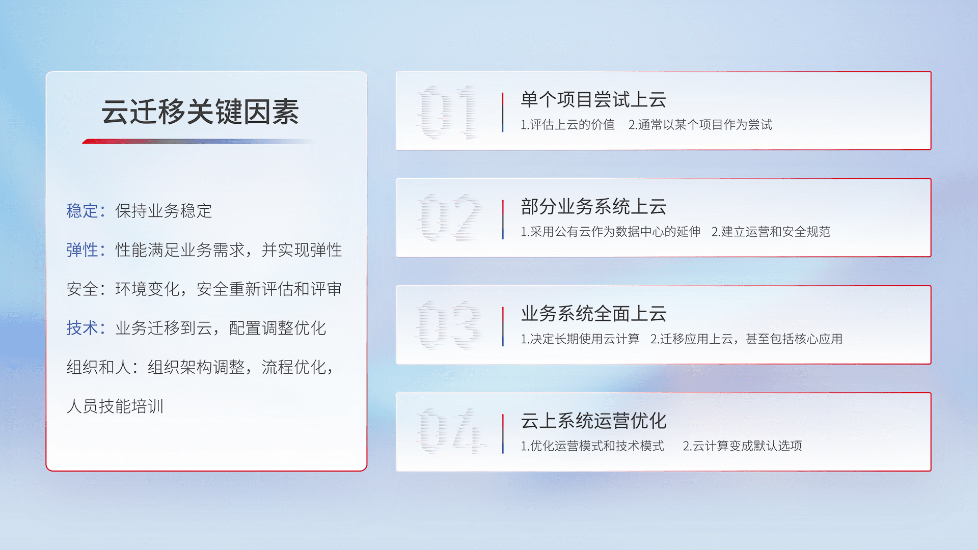 结合实际业务,,,,从规划设计、、、云平台选型、、、云原生改造、、、数据迁移、、、集成交付,,,,迁移全过程为客户识别最佳上云路径,,,做好风险识别管理,,,设计网络架构、、、身份权限、、、安全审计合规、、、操作审计、、日志审计、、、监控告警策略、、、多站点容灾设计等,,对云上基础设施进行整体规划,,,,提升IT治理水平,,以满足弹性、、、高可用、、、、高性能的需求。。。